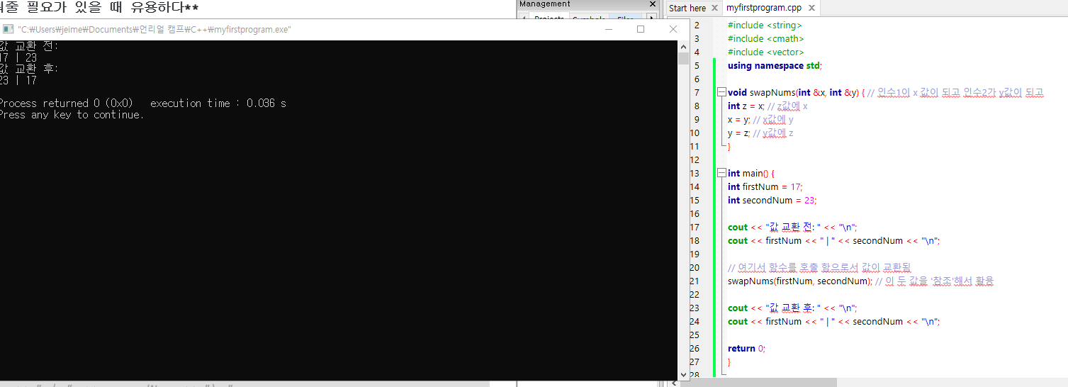 void swapNums(int &x, int &y) { // 인수1이 x 값이 되고 인수2가 y값이 되고