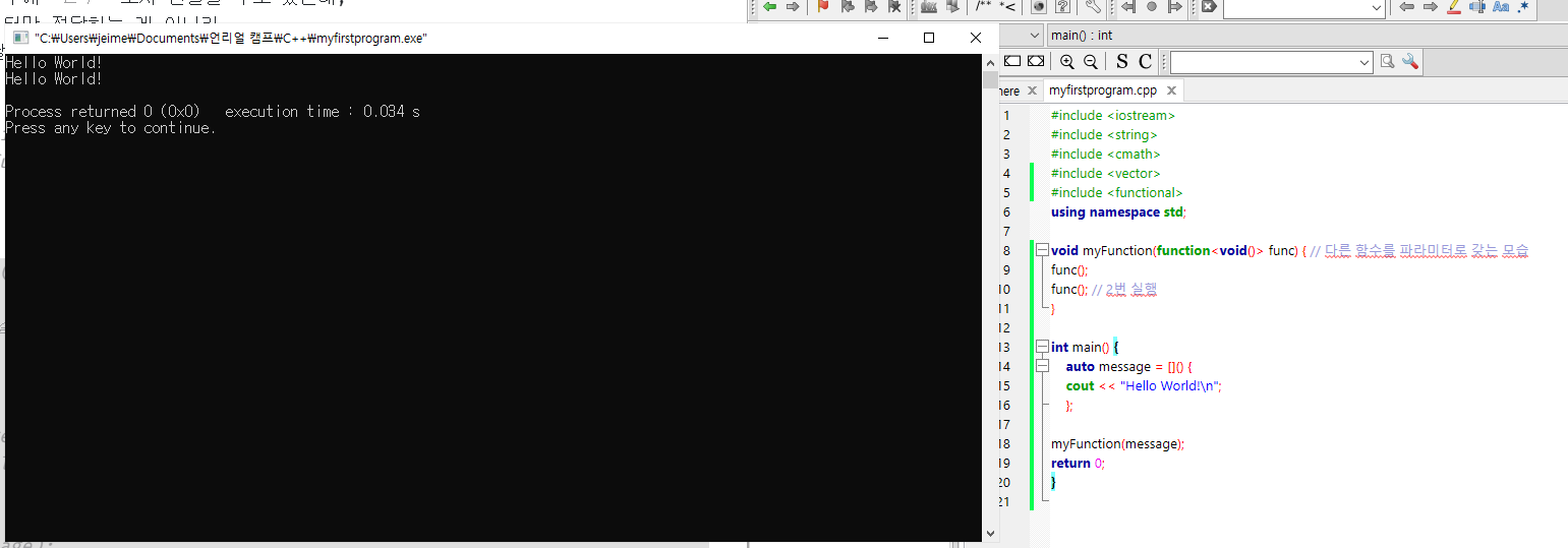 void myFunction(function<void()> func) { // 다른 함수를 파라미터로 갖는 모습