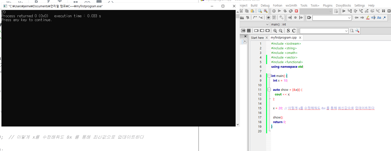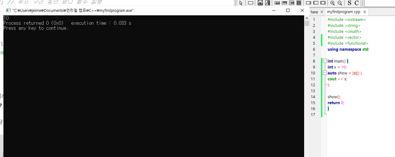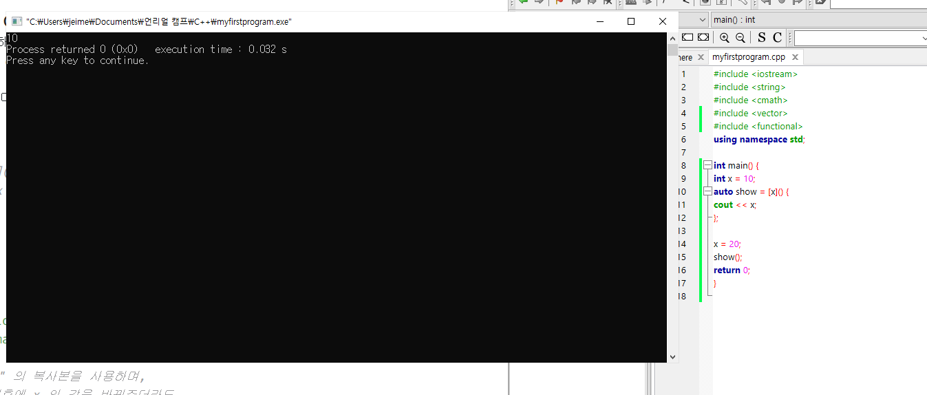 아래 예시에서, 람다는 값(복사본) 을 기준으로 변수 x 를 "포착"한다