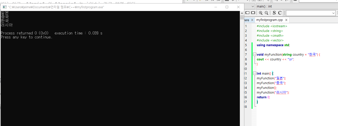 void myFunction(string country = "한국") {