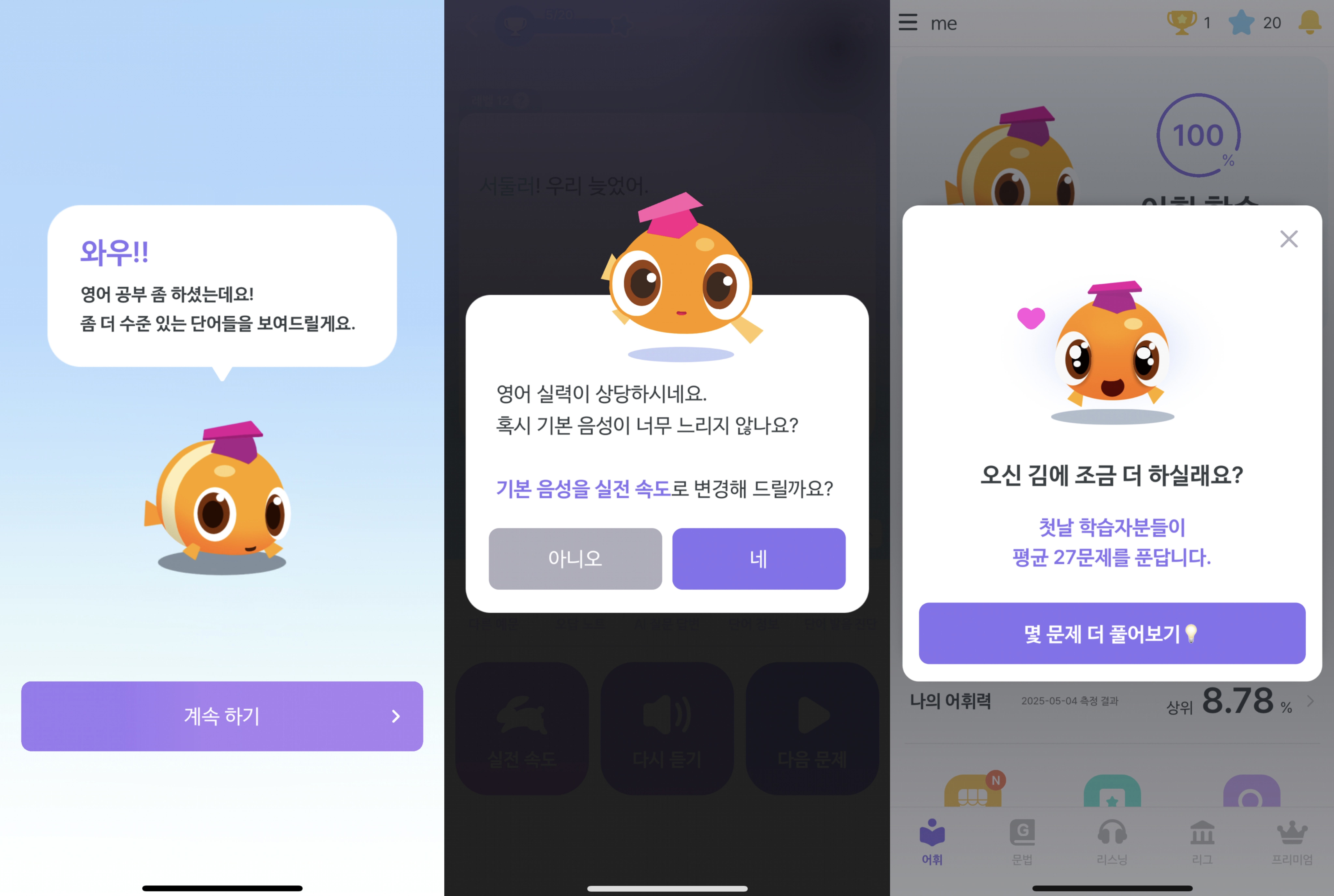 말해보카 앱은 사용자의 데이터를 상당히 많이 수집하고 그 데이터를 적극 활용하여 유저의 흥미를 지속시키는데 사용하는 것이 느껴진다.