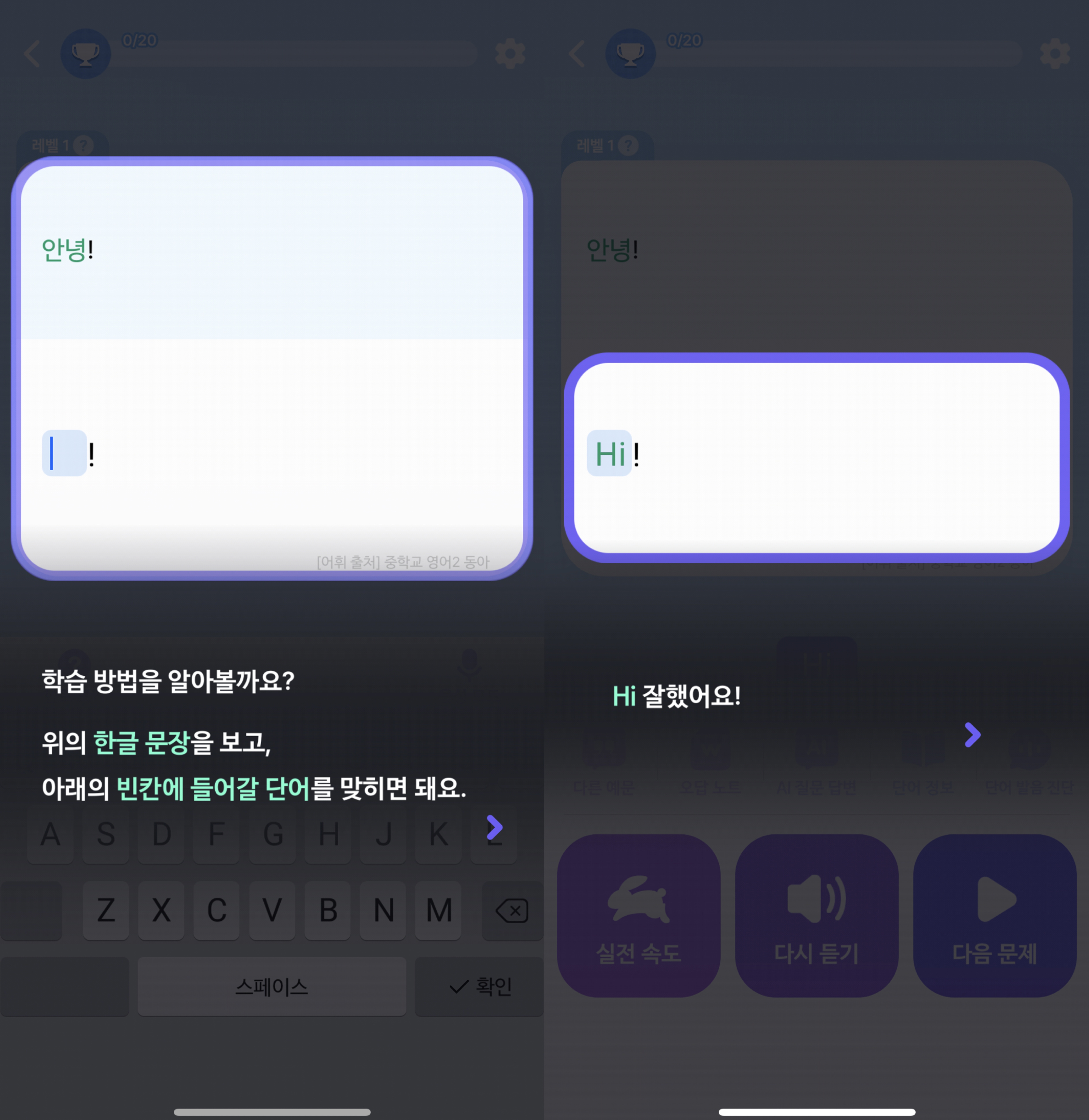 답안 제출시 암묵적으로 글자수 힌트를 제공하고, 단어에 대한 예문, 오답 노트 등 다양한 기능을 통해 사용자가 흥미를 잃지 않도록 함.