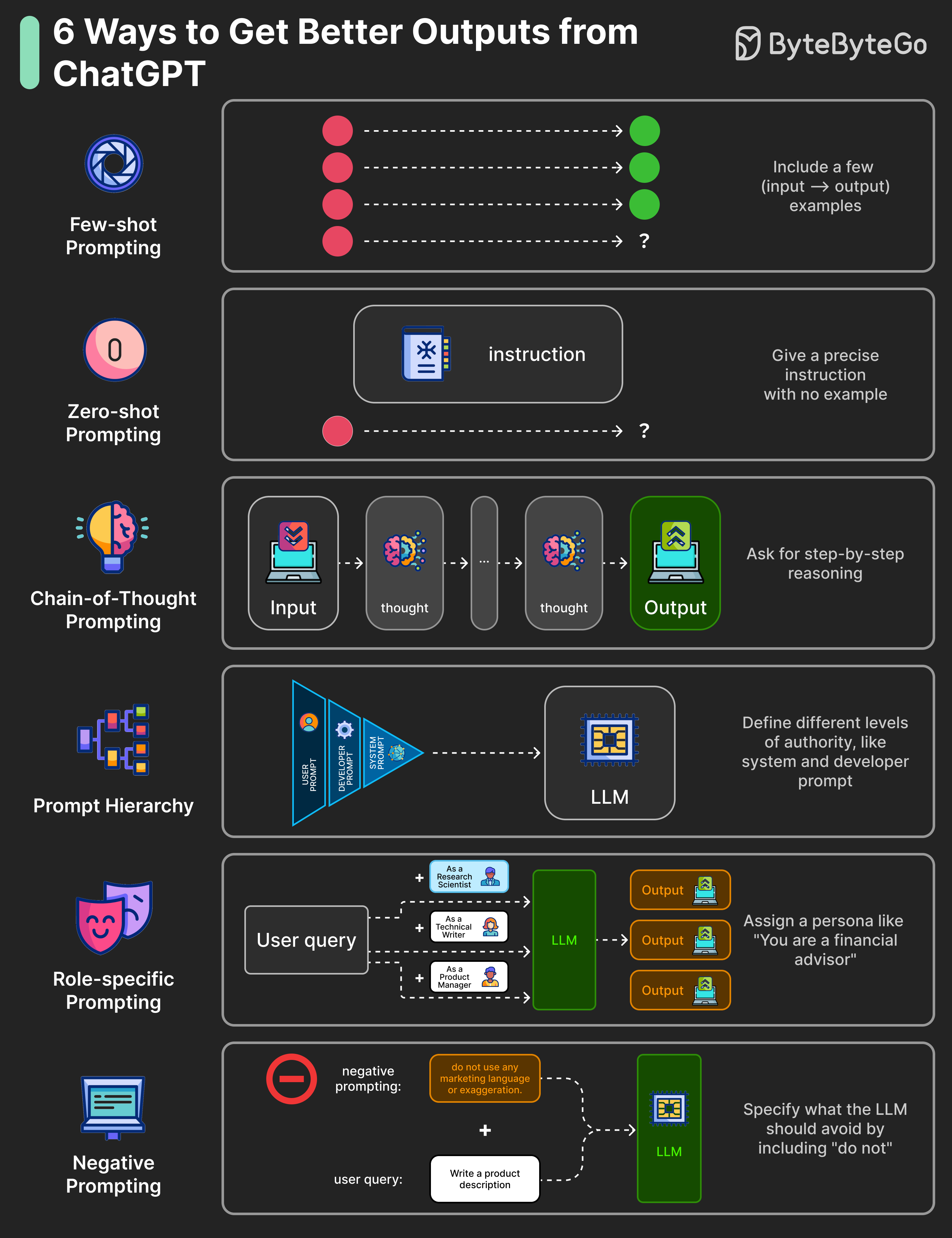 저는 LLM을 이용해서 문서 작성을 적극적으로 하는 편입니다. 정리 거리를 던져주고 작성을 해달라고 하는데 간혹 제가 의도한 대로 글을 잘 안 써주기도 하고, 프롬프팅을 어떻게 하는지에 따라서 달라지기도 하더라고요. 마침 구독하는 bytebytego에서도 프롬프트 방법에 대해 얘기하고 있어서 해당 아티클을 기반으로 내용을 추가하여 정리해보았습니다.