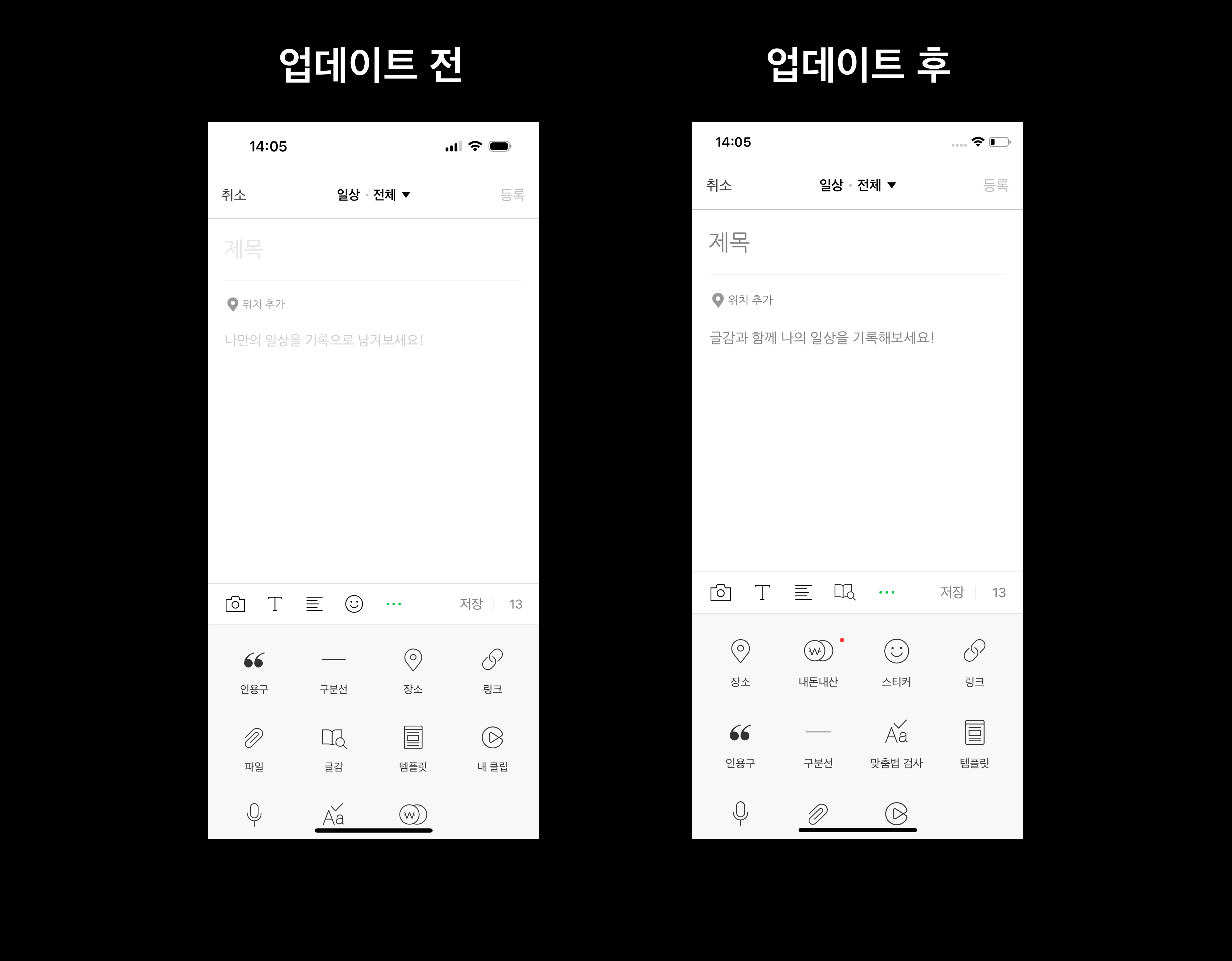 이전에는 글감이 더 보기로 들어가야 작성할 수 있었다면 지금은 더 보기를 가지 않아도 아이콘을 이용해서 글감을 선택할 수 있어요.