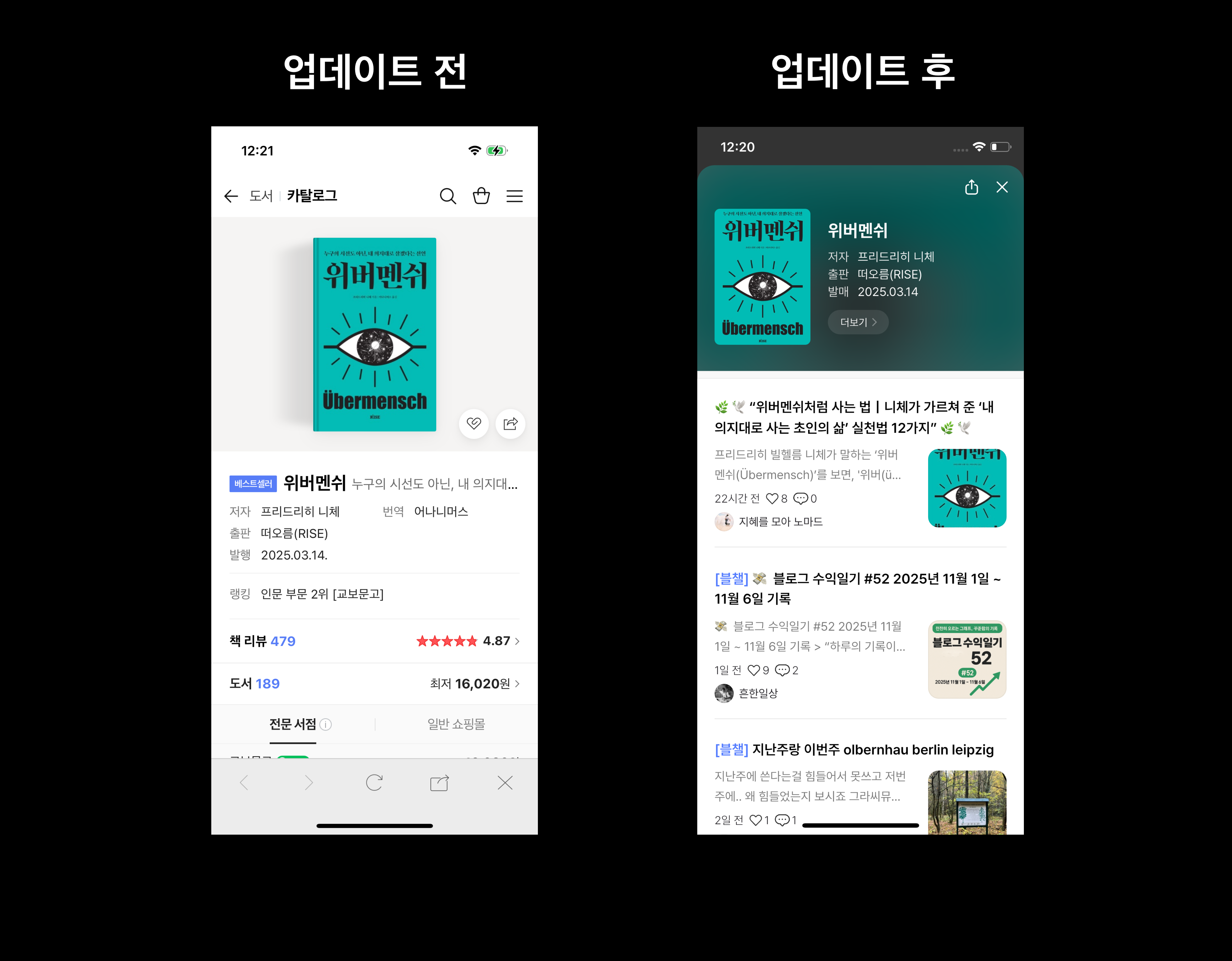위의 내용과 비슷하게, 제 블로그의 홈 화면의 글감 섹션에서 전체보기를 해야만 제 글감 내용을 확인할 수 있고, 다른 사용자들의 의견을 보려면 또다시 해당 피드 안으로 이동해야 하는 번거로움이 있었습니다.