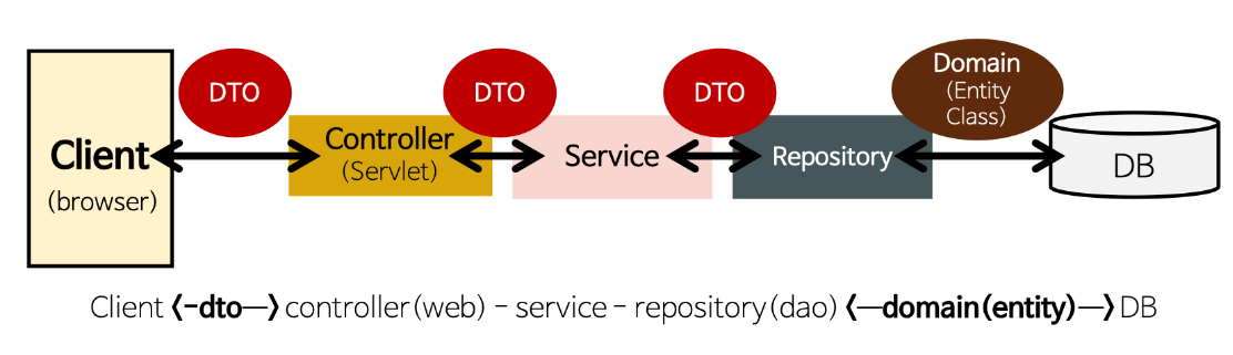 - 즉, 데이터에 접근 할 때 호출이 많아져 느려지니 실제로 DB에서 호출된 데이터가 여러 층을 지나는데 이 때 여러 층 간 데이터를 교환할 때 사용하는 객체이다.