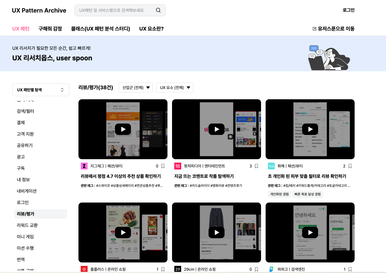 UX Pattern Archive는 UX 패턴별 검색과 서비스별 탐색으로 크게 나뉩니다. 보시다시피 패턴과 도메인이 세분화되어 있어 구조적으로 잘 정리되어 있습니다.