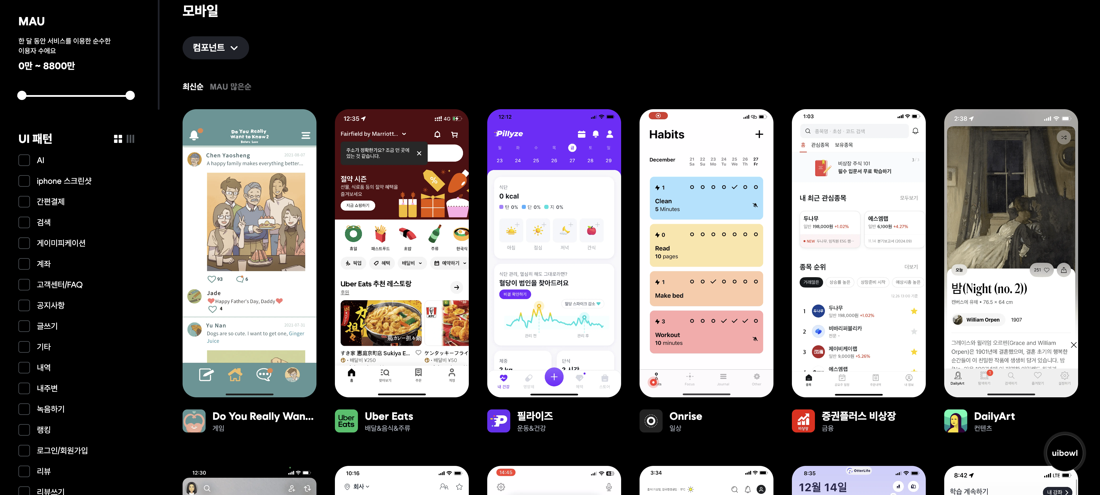 제 기준 국내 서비스 중에서 가장 정리가 잘 되어 있는 서비스입니다. UI 패턴, 카테고리, 컴포넌트별로 분류가 체계적으로 잘 되어 있고, 모바일뿐만 아니라 웹사이트 레퍼런스도 제공합니다. 패턴이나 카테고리, 컴포넌트가 워낙 세부적으로 나뉘어 있어서 웬만한 레퍼런스는 거의 다 찾을 수 있습니다.