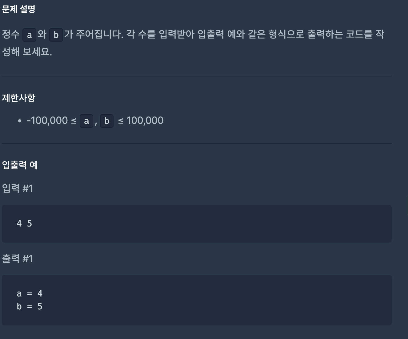 print("a = " + a + "b = " + b)