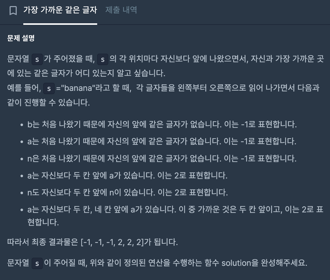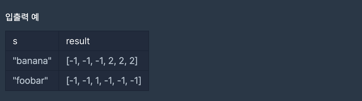 save변수를 만들어서 for문이 반복 될때마다 해당 값을 저장 하는 공간을 만들었습니다.for문으로 어떻게 값의 위치와 값을 쉽게 저장할 방법을 찾다가 enumerate를 찾았습니다.enumerate : 이 함수는 반복문에서 반복 가능한 객체(리스트, 튜플 등)의 인덱스와 값을 동시에 추출할 수 있도록 도와줍니다..find는 값을 찾지 못했을때 -1이 출력되는걸 알고 해당 값이 나타났을때 save에 해당 문자를 저장하고 answer에 -1을 대입 해주었습니다.elif로 save에서 해당 문자를 찾았을시에 indices라는 변수를 만들어 중복값의 위치를 배열로 저장하였습니다.for문과 enumerate를 사용해서 다시 index와 value를 save에서 처음 반복된 문자와 비교해서 있을시 해당 위치를 indices에 저장했습니다.last_indices변수를 만들었습니다.index-last_indices를 하여서 해당 값만큼 answer에 저장했습니다.하지만 해당 코드는 예제는 성고했지만 알고리즘 테스트에서는 실패 하였습니다.