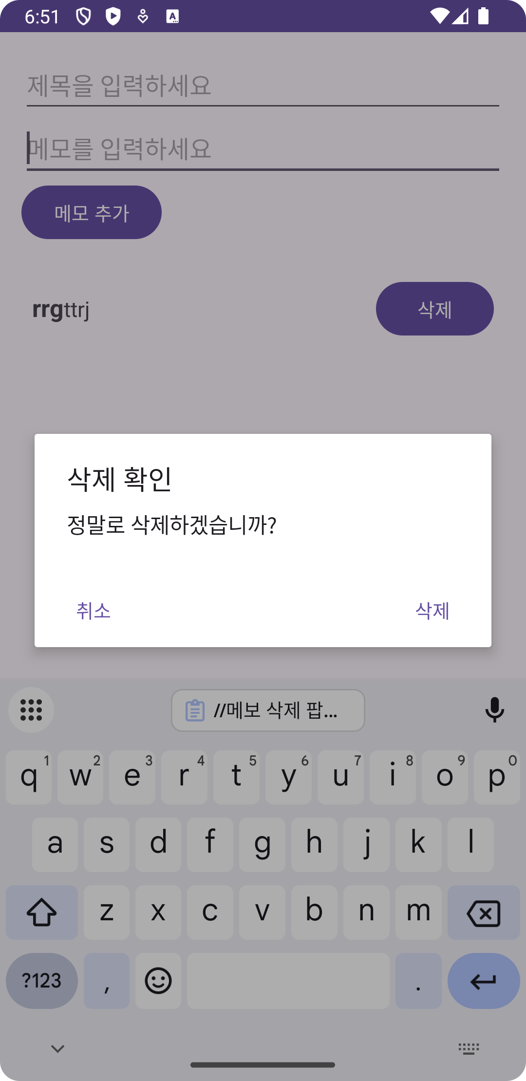지금 앱은 삭제버튼 클릭시 바로 삭제가 되기 때문에 원하지 않은 삭제가 될 가능성이 있기에 해당 기능을 추가하도록 하겠습니다.