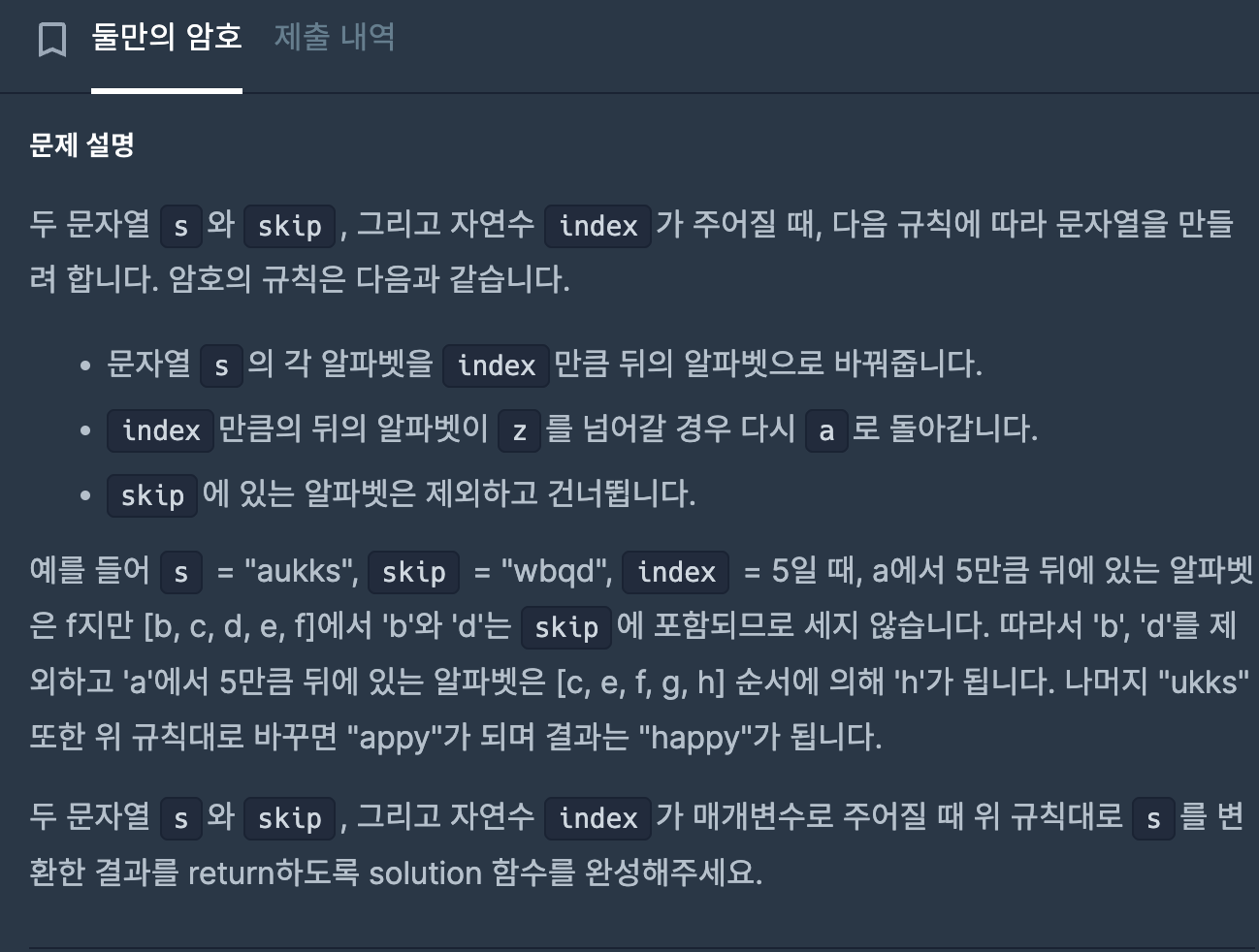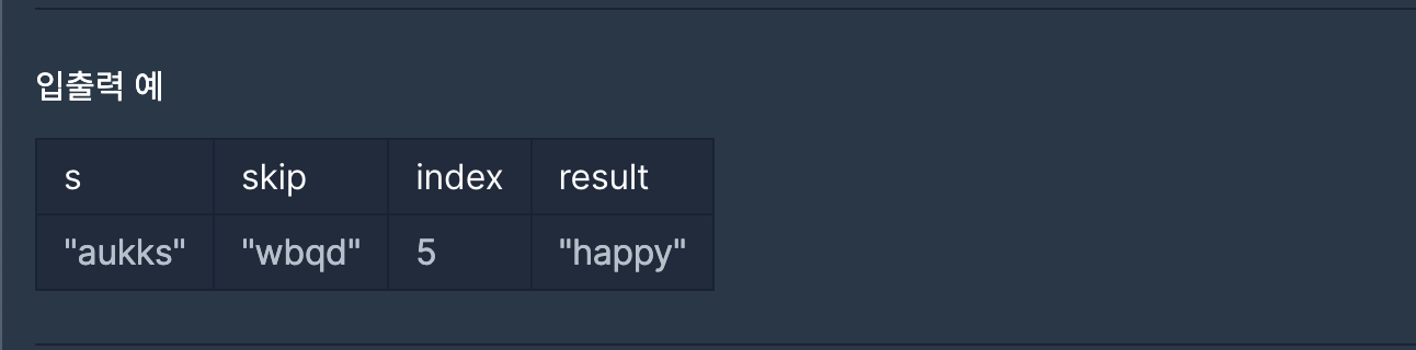 skip으로 인해 지워진 alpha변수에 해당 알파벳이 몇번째인지 찾고 + index 한뒤 % len(alpha)로 z가 넘어갈시 a로 다시 돌아가게 만들어 줍니다.