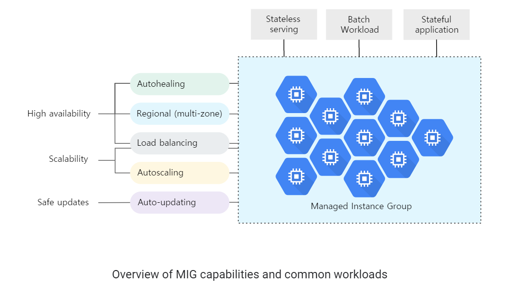 - Managed instance groups(MIG) : multiple identical VMs, 만들면 automatically scale instances(자동확장)를 할 수 있음.