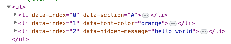 console.log(list[2].dataset) // DOMStringMap {index: '2', hiddenMessage: 'hello world'}