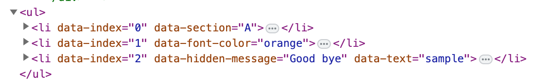 다음과 같이 li태그에 data-index data-hidden-message data-font-weight 커스텀 속성을 적용해보겠습니다.