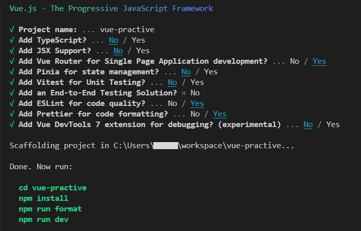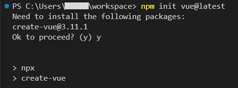 npm init vue@latest 명령어를 입력 후 엔터, 패키지 설치가 필요하다면 y 입력