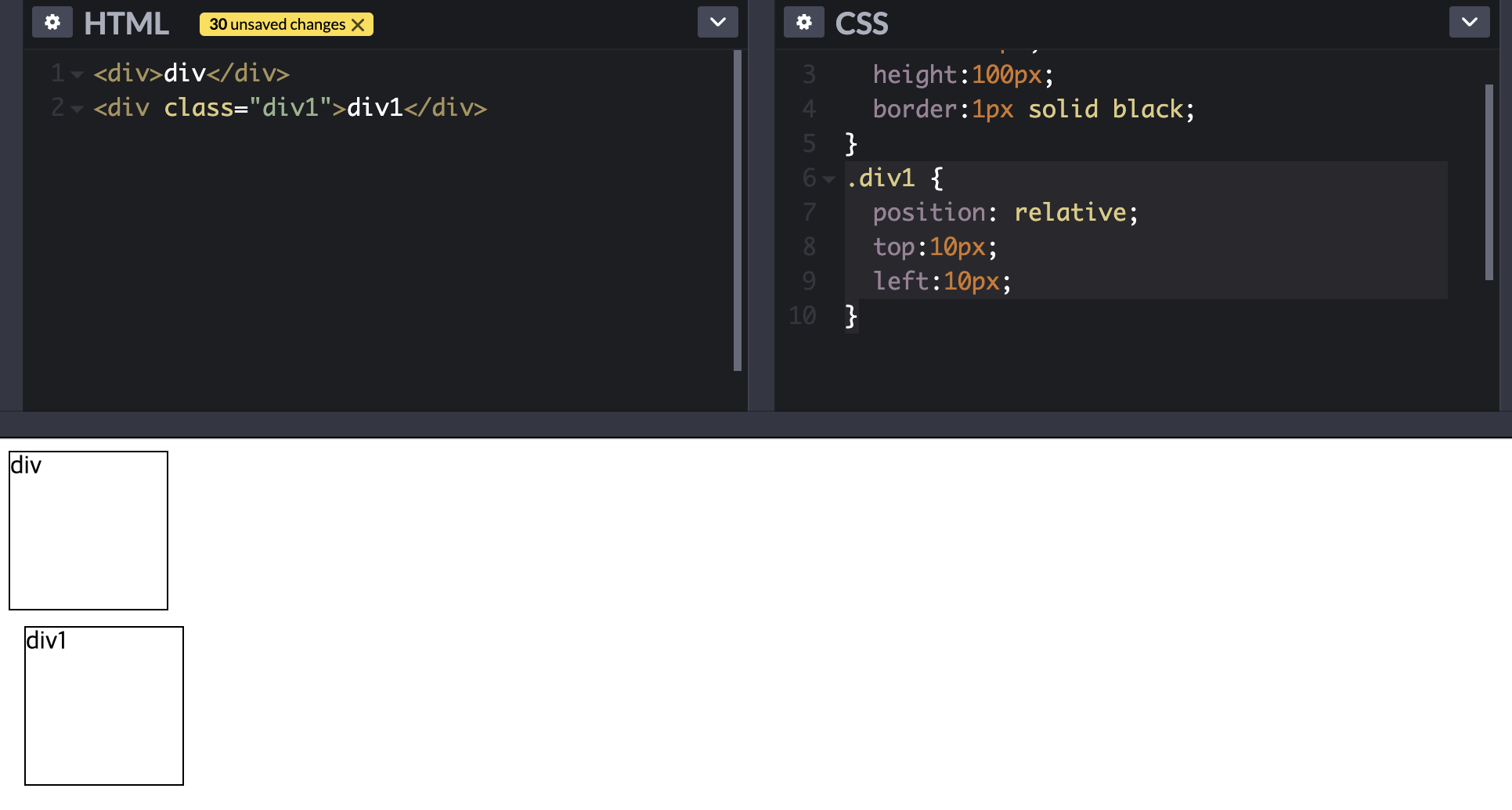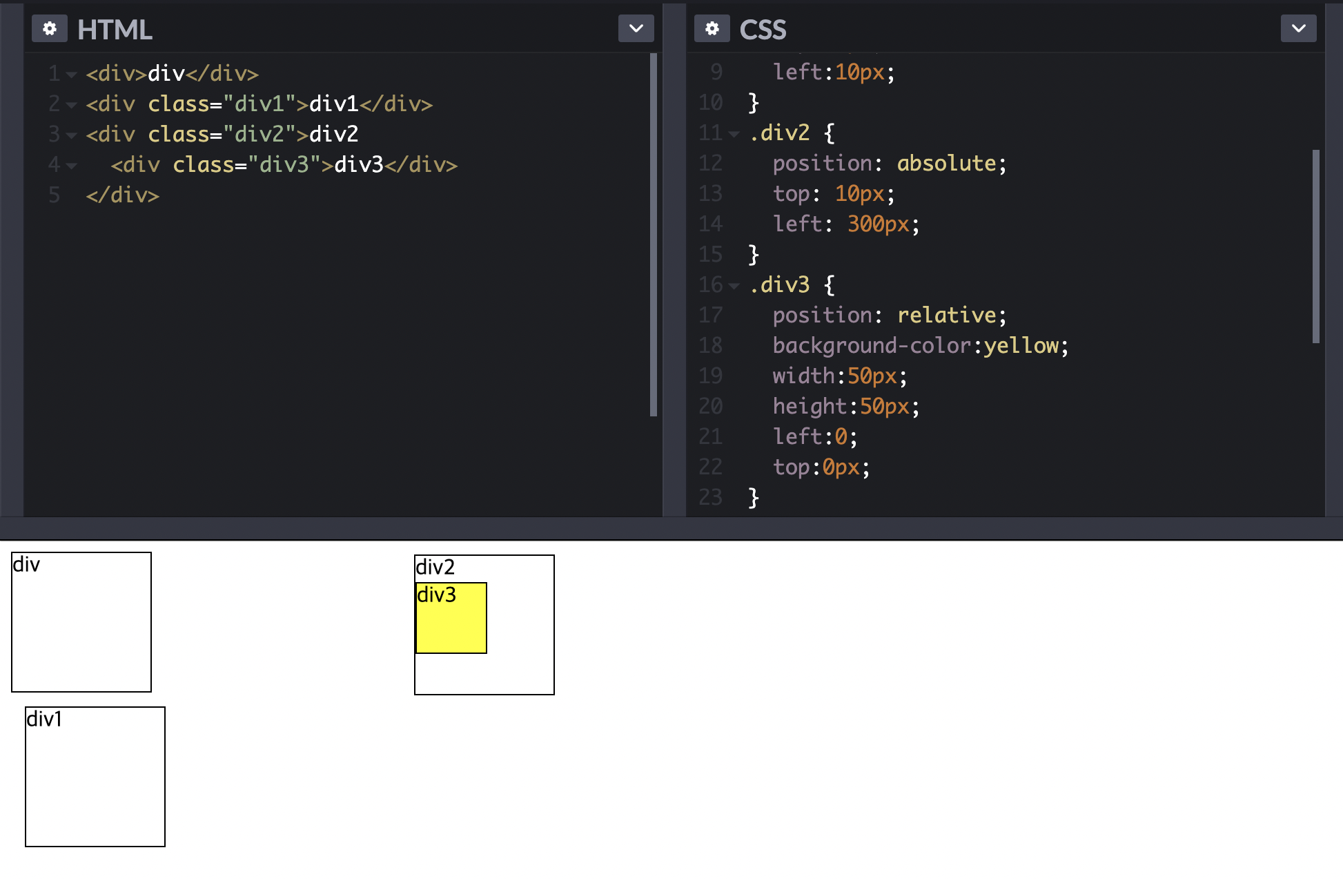 >[캡쳐1] relative 사용 예제. 이전 요소가 배치 된 다음 지점부터 top 10px, left 10px 위치에 배치됨.
