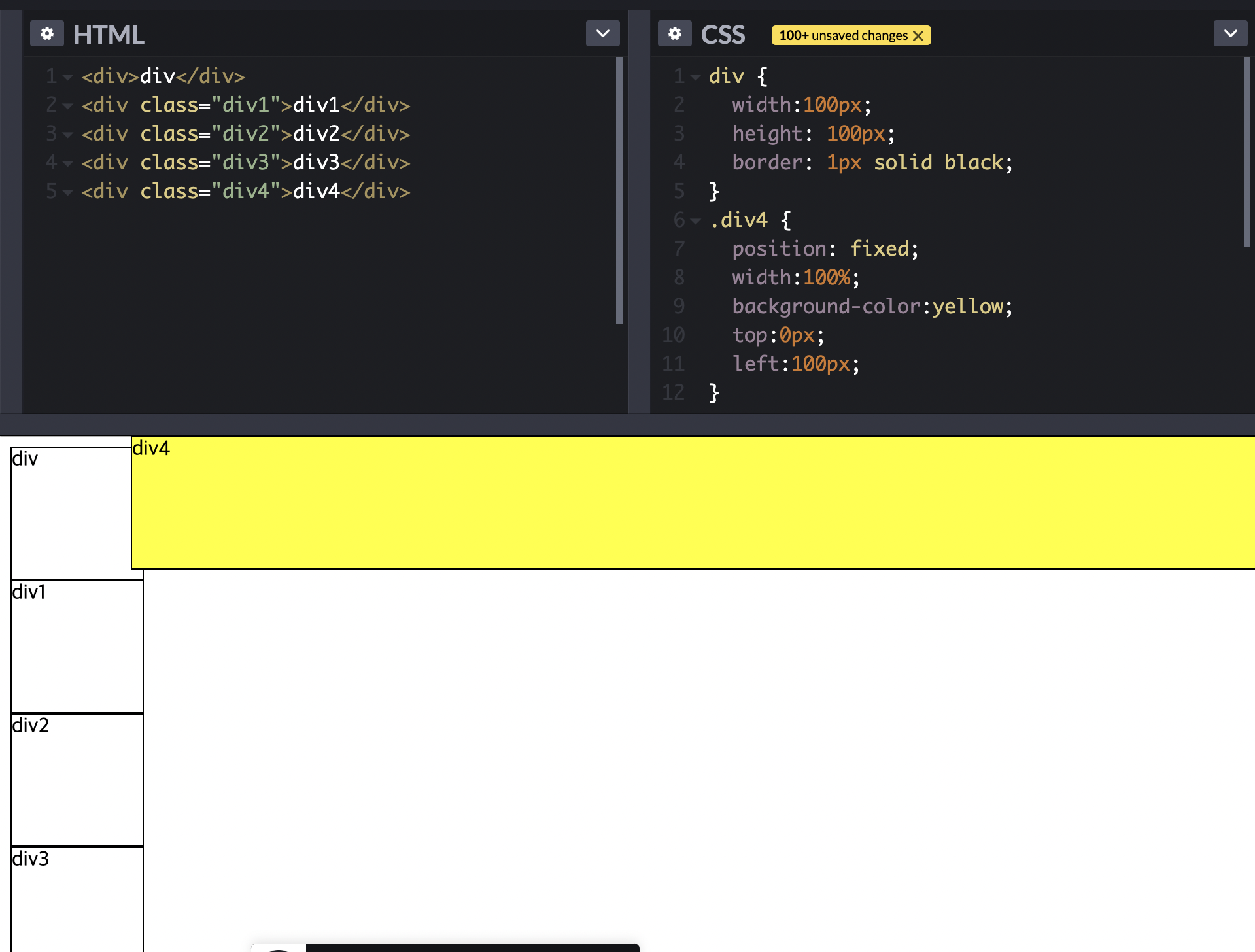 >[캡쳐3] fixed 사용 예제. 초기위치 기준으로 top 0, left 100px 위치하며 타 요소와 겹칠 경우 상위에 표시. 스크롤하여도 항상 고정된 위치에 자리함.