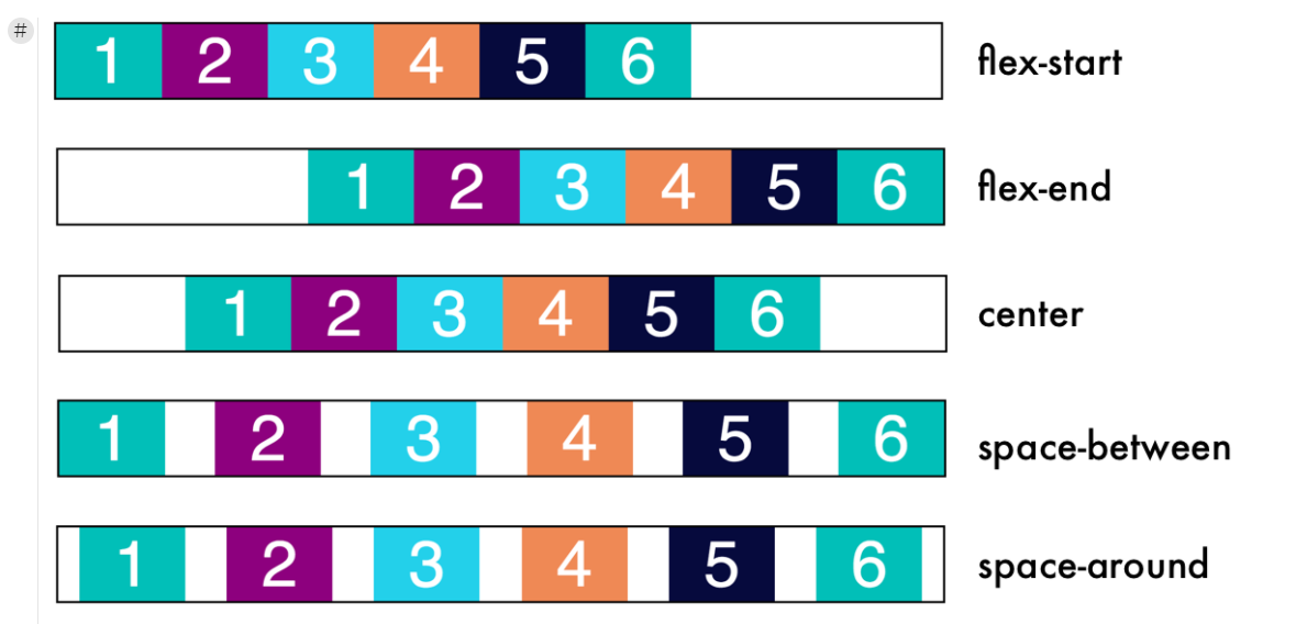 display: flex 를 주었을 때 main axis의 방향으로 (dafault: horizontal) 아이템들을 주변에 space를 분배할때 사용된다.
