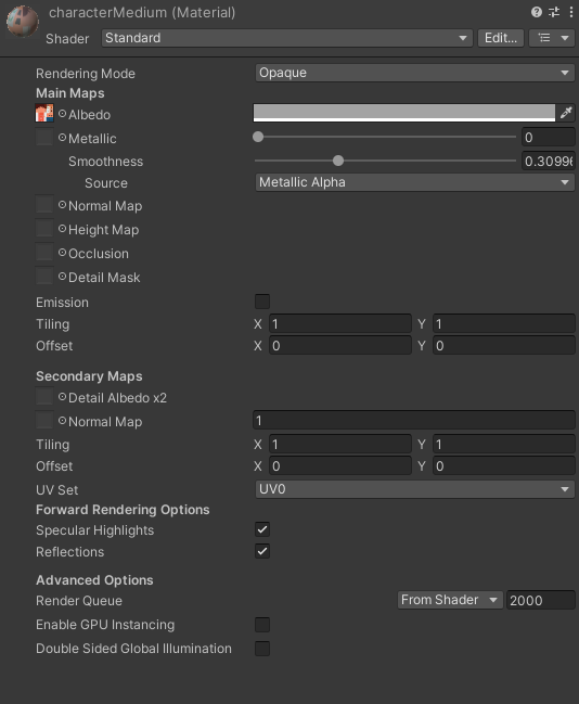 다운받은 에셋을 임포트해서 모델을 씬에 배치하면 텍스처가 자동으로 적용되지 않는다. 이 때 모델에 적용되어 있던 Material의 복사본을 만들어 해결했다. Create Material Preset을 눌러 모델의 material과 동일한 것을 생성한다.