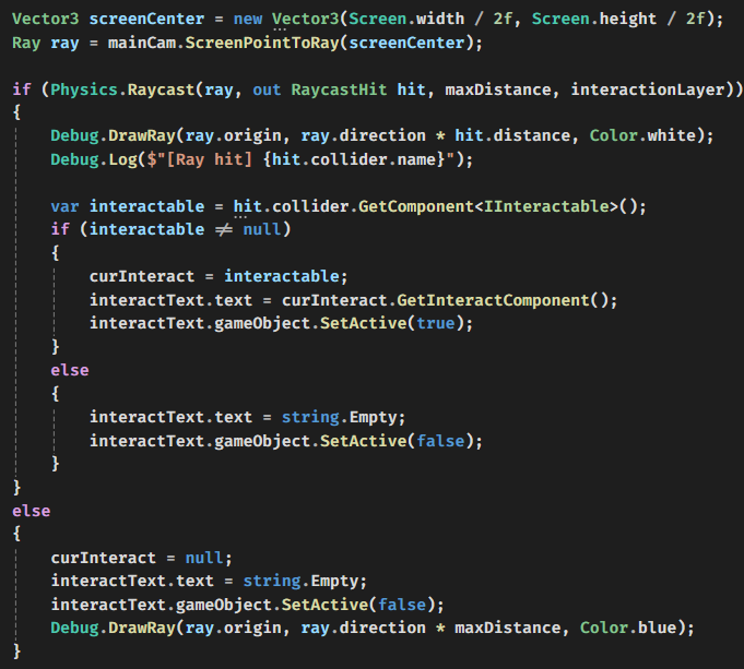 카메라 중심점에 Ray를 쏴 특정 Layer와 상호작용 가능하게 했다.