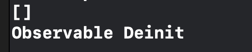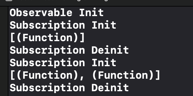 Observable이 init되고 Subsciption이 init되면서 dispoable과 observer가 추가가 되고 Subscription이 참조된게 없으므로 바로 deinit되는 것을 확인 할 수 있다. Observable의 두 개의 Subscription을 반영했기 때문에 disposables 배열도 두 개가 되는 것을 확인 할 수 있다.