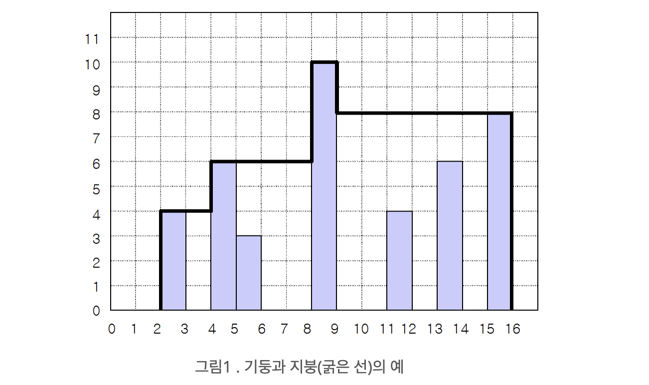 n개의 직사각형 기둥(폭은 모두 1m)으로 구성된 창고의 지붕을 만들 때, 옆에서 바라본 창고 다각형의 면적의 최솟값을 구하는 문제이다.
