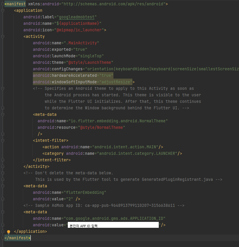 여기서 App Id는 app/src/main/AndroidManifest.xml에 입력되고