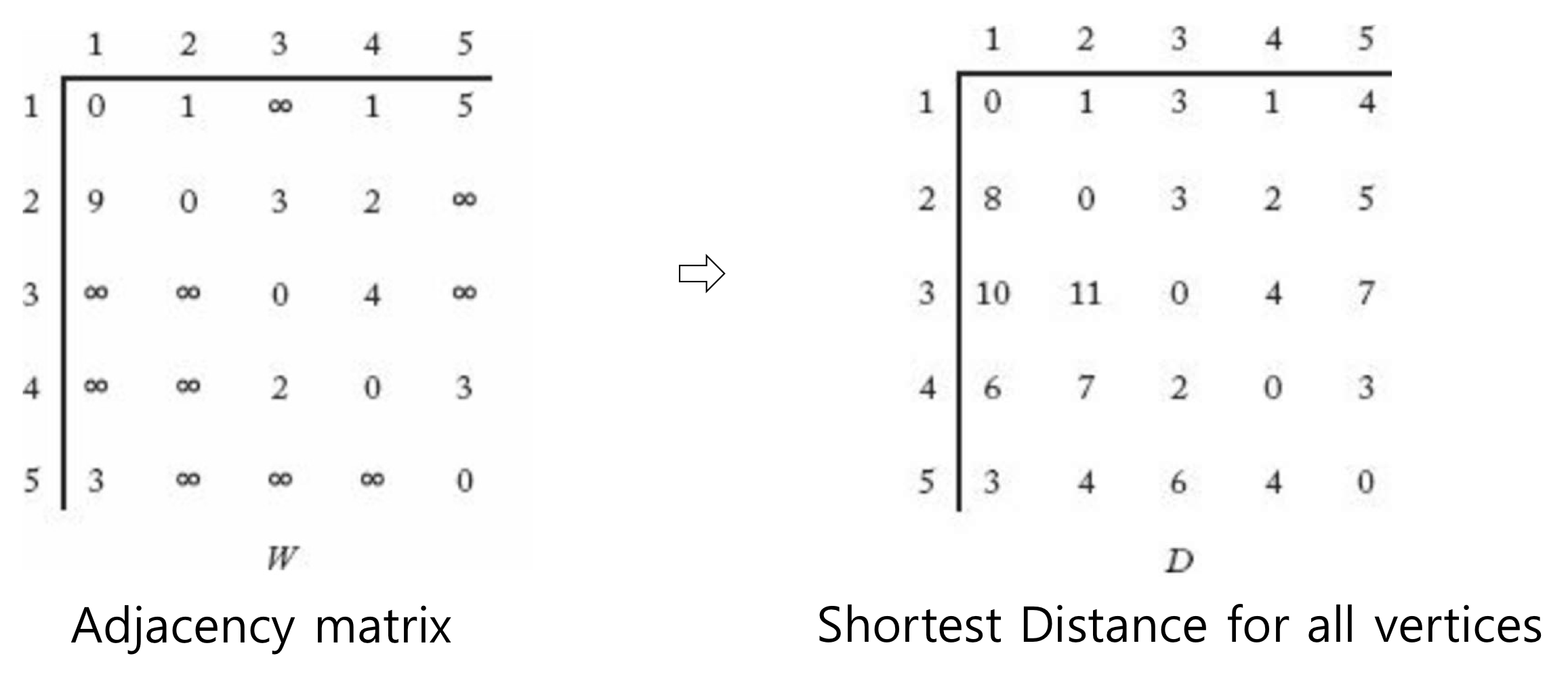 vᵢ에서 vⱼ로의 Shortest Distance는 vₖ에 대해 다음 두 가지 경우가 존재 (D(k)[i][j] : vᵢ에서 vₖ를 경유하여 vⱼ로 가는 Distance)