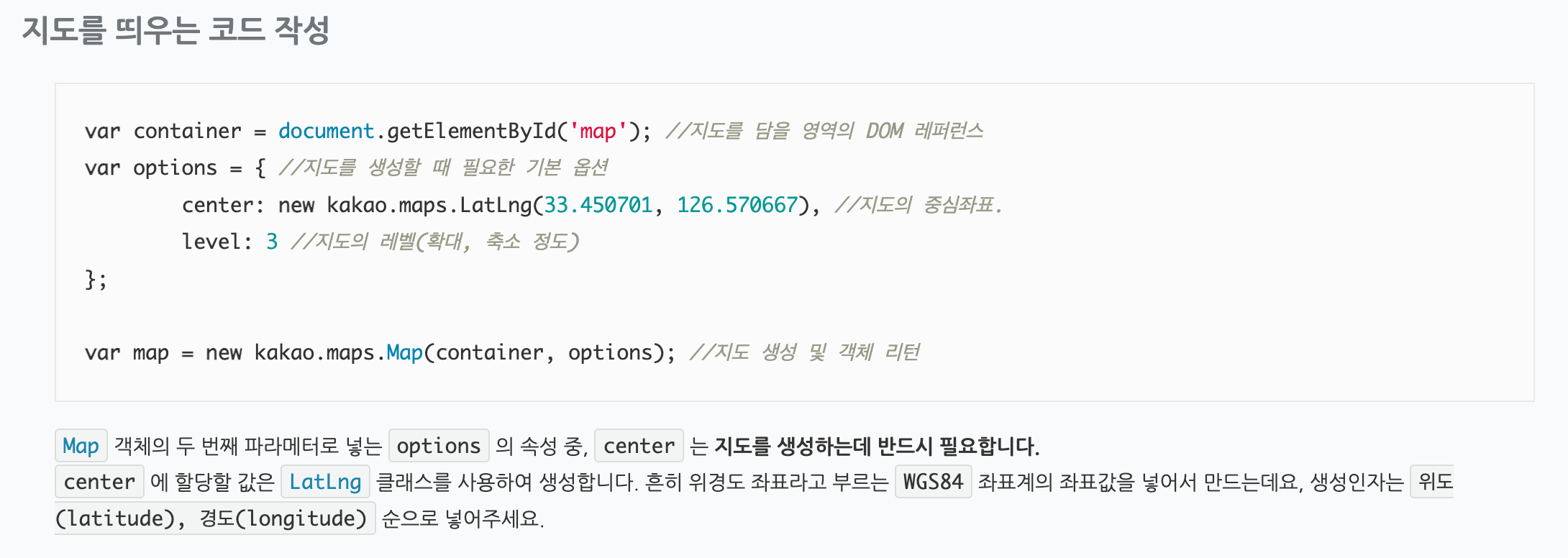 그 영역 안에서 지도를 띄우기 위해서는 지도의 중심좌표를 가리키는 center와 확대 축소의 정도를 가리키는 level 의 옵션이 필요하다. 이 옵션을 가지고 지도를 생성하고 리턴한다.