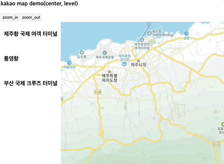 지도를 확대, 축소하기 위해 버튼 두 개를 생성하여 클릭시 zoom 함수가 구현된다.