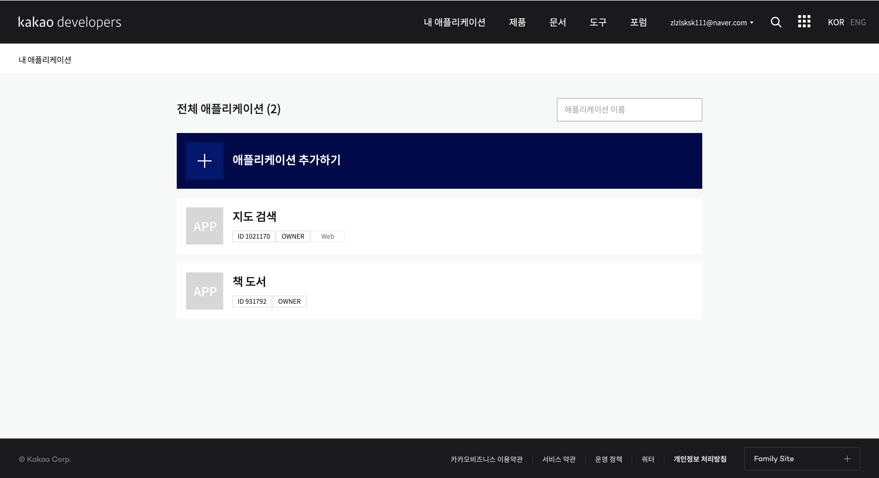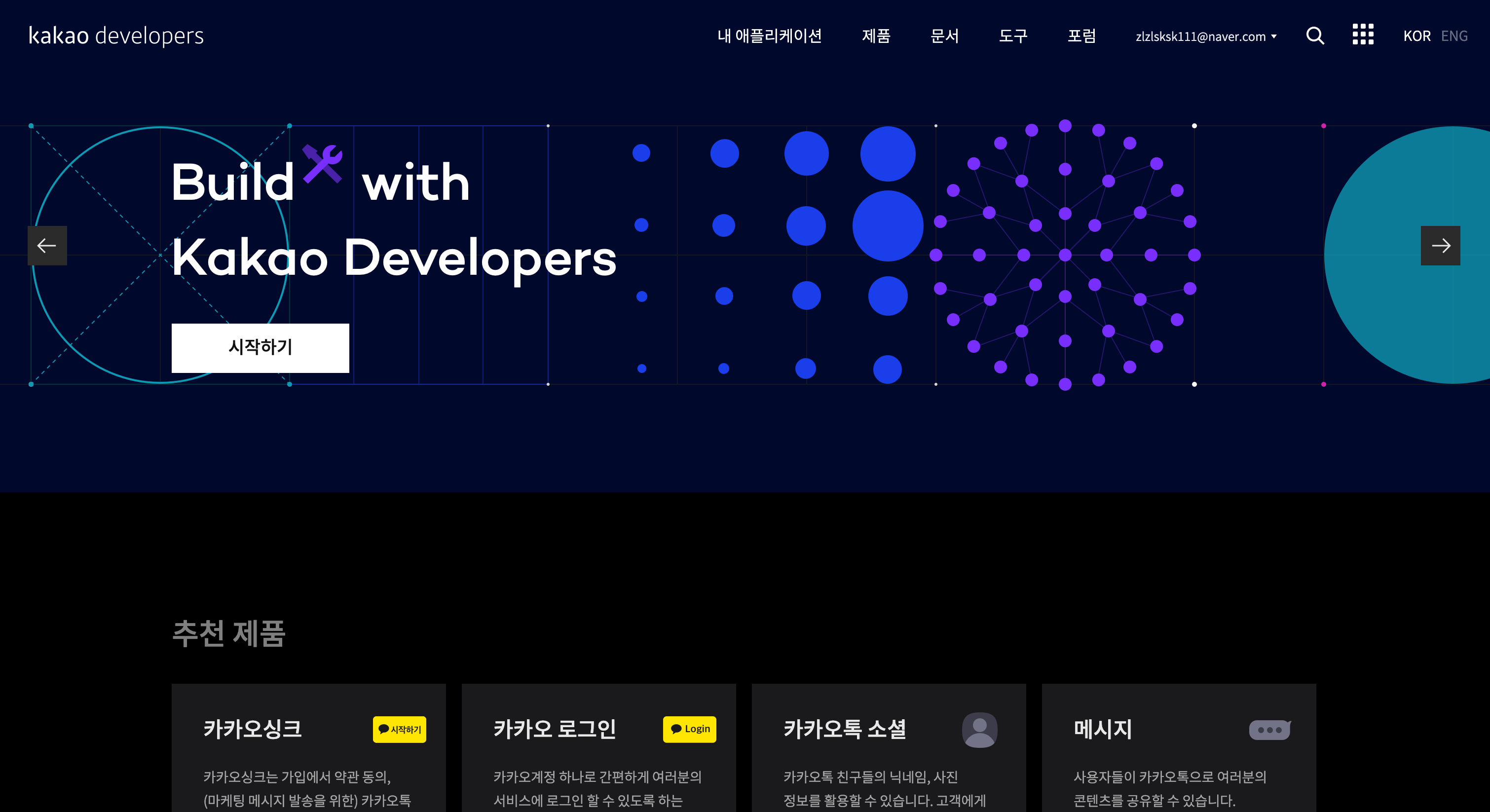 https://developers.kakao.com/ 에서 시작하기 버튼을 눌러