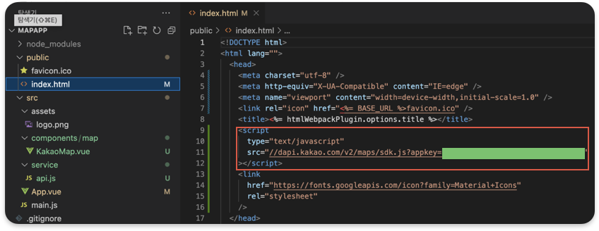 kakao map api 를 잘 사용하기 위한 가이드 홈페이지에 나와있는 순서 중에서 vue 파일 내에 step 1 에서 발급받은 javascript api key 를 넣어주어야 사용할 수 있다.