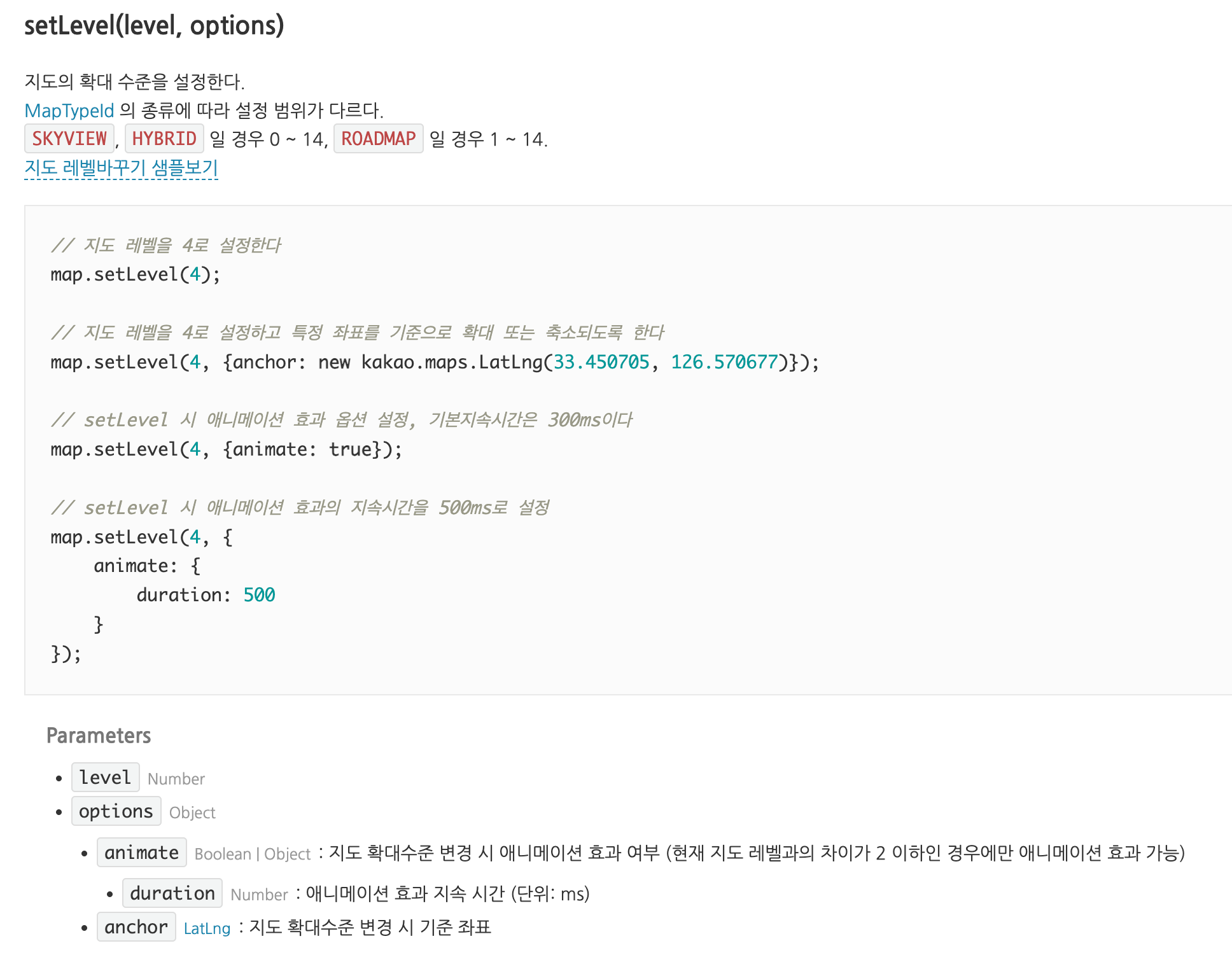 zoom 함수는 현재 옵션의 level 에서 매개변수로 받아온 값 1 이나 -1값을 연산하여 옵션의 level 를 갱신해준다.
