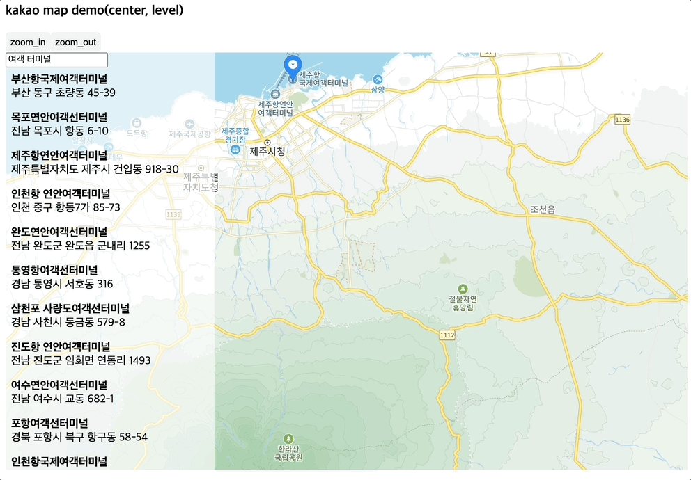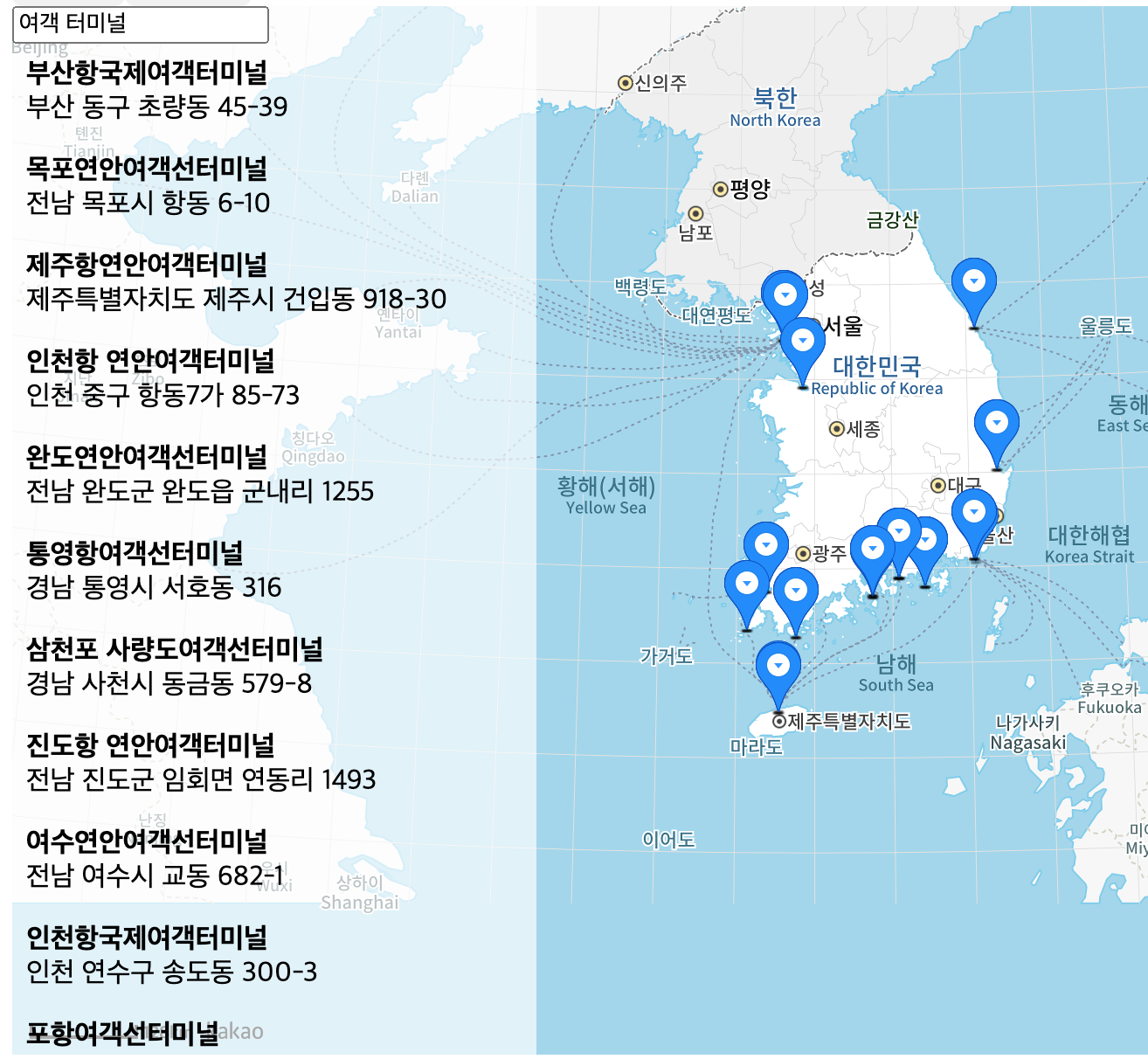 '여객 터미널' 이라는 검색어를 enter 키를 통해 입력하면 결과값들을 목록으로 한 눈으로 보여진다.
