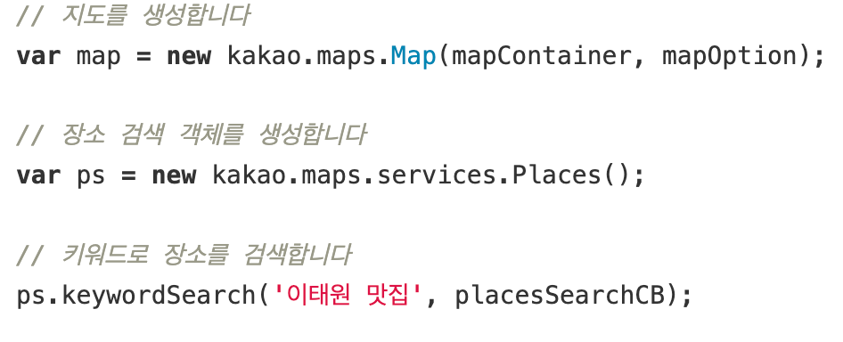 에 나와있는 예제 코드를 보면 장소 검색 객체를 생성하고 그 키워드로 keywordSearch