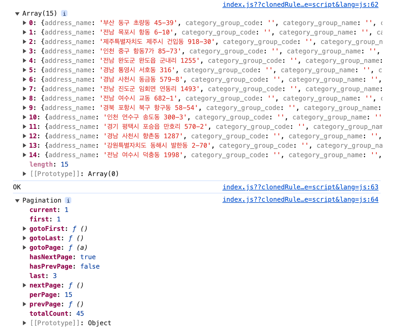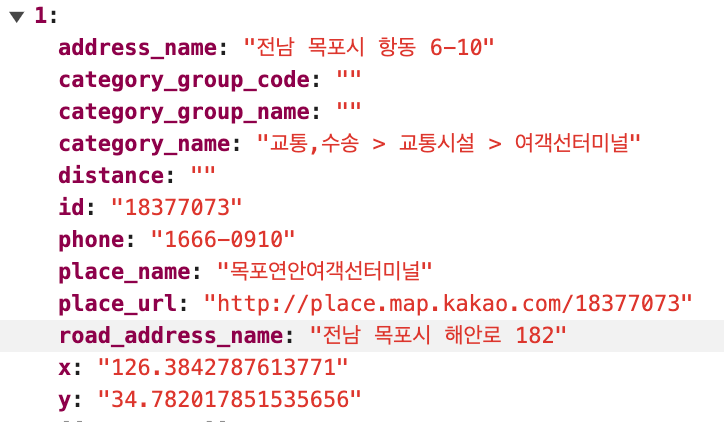 여객 터미널을 검색했더니 data는 장소 검색된 배열의 값으로, status 는 결과값에 따른 상태값, pagination 은 그 배열과 관련된 페이지네이션 정보와 같았다.