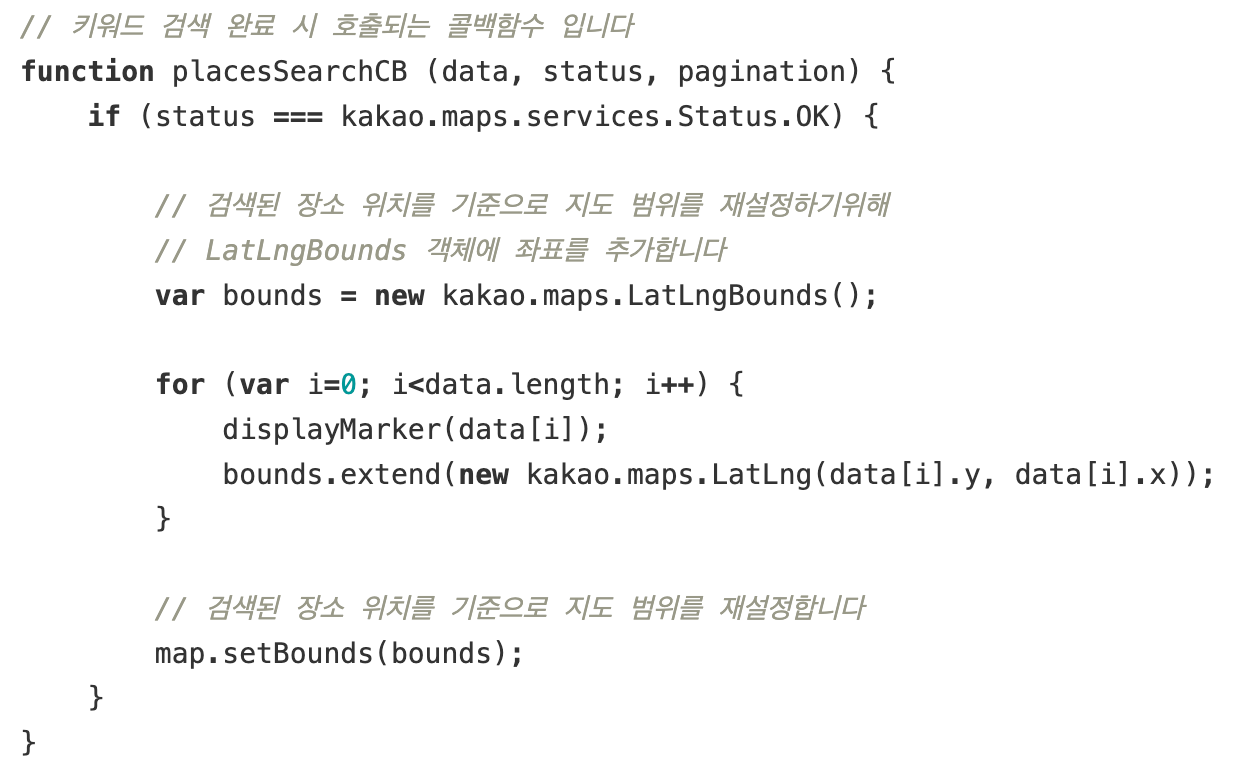 메서드를 이용해 장소를 검색할 수 있다. 첫번째 매개변수는 검색하고자 하는 장소이고, 두번째 매개변수는 호출되는 콜백함수로 각각이 가리키는 data