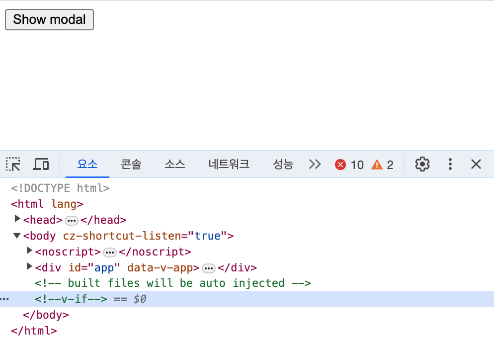이라는 버튼을 클릭하면 on 바인딩을 통해 show 값을 true 로 변경할 수 있다.<Teleport>