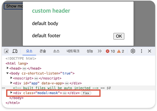 자식 컴포넌트는 모달을 나타낼 수 있는 어두운 바탕화면 div 과 컨텐츠를 나타내는 div 가 존재해야 한다. 이는 class명을 modal-mask 와 modal-container 로 구분하여 css 로 설정을 해준다.