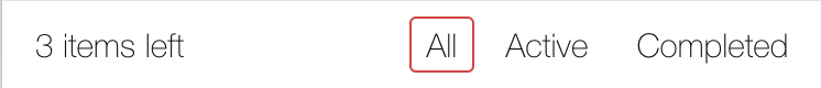 위와 같이 todos 리스트를 나열할 때 하단에 아이템의 갯수와 아이템을 필터링할 수 있는 필터가 존재한다. state 를 설명할 때 filters 객체 안에는 all, active, completed 로 세 가지 filter 종류가 존재한다고 했다.