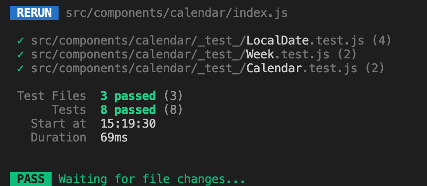 달력 라이브러리를 사용하지 않고 직접 하나하나 메서드와 클래스를 통해 달력을 구현해서 뿌듯하다. 그리고 TDD 를 통해 클래스 하나씩 테스트를 하는 것을 통해 프론트엔드를 하면서 실직적으로 작성하고 통과하는 과정을 배워서 유지보수하기 쉬울 것 같다는 생각을 했다.
