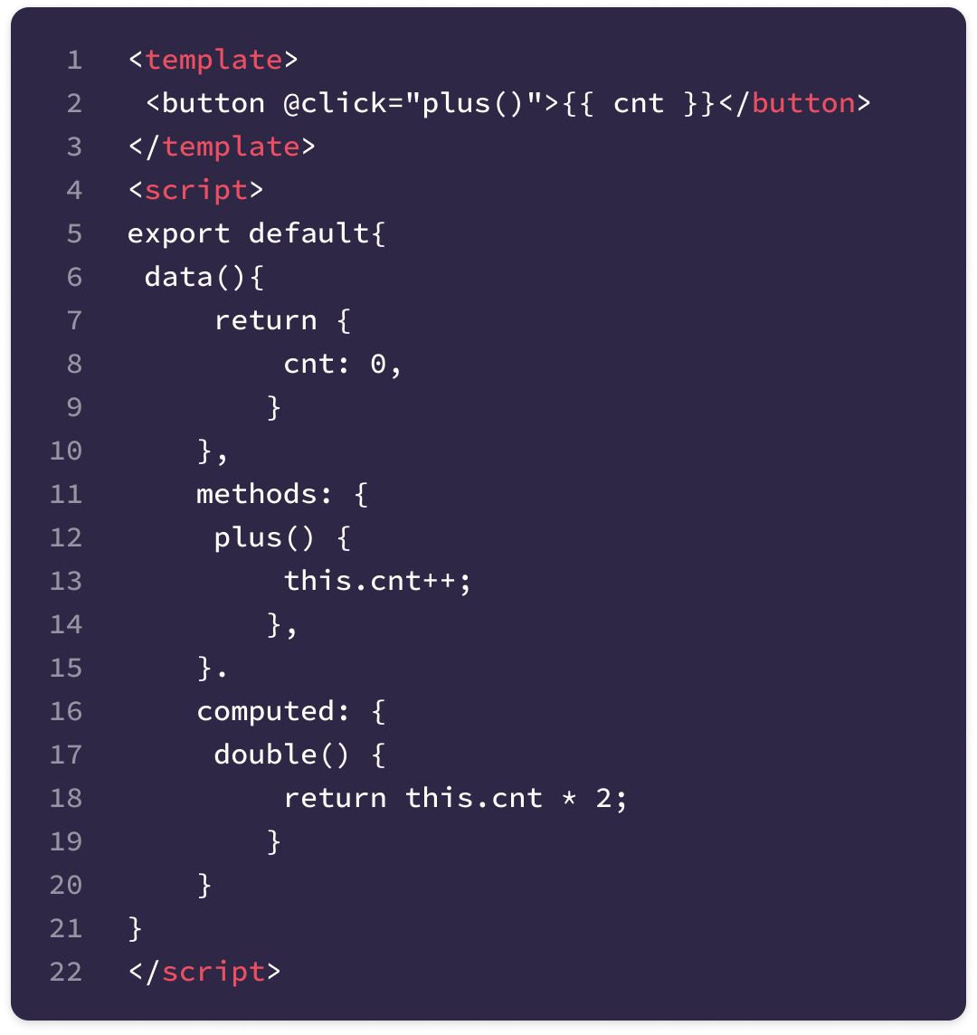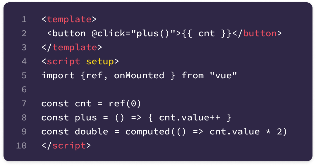 | data, methods, computed 에 각각 로직이 흩어져 있다. | data, methods, computed로 로직을 구성하지 않고 로직을 모아 사용할 수 있다. 또한, export default{ } 를 제공하지 않아서 일반적인 JavaScript 를 작성하는 것처럼 컴포넌트 코드를 작성할 수 있다. |