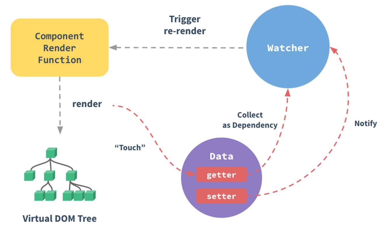 JavaScript Object 를 생성하면 기본적으로 접근자 프로퍼티라고 하여 getter 와 setter 함수가 자동으로 포함된다. Proxy 를 통해 Object 의 get() 과 set() 메서드를 재정의하여 원하는 동작을 만들 수 있다. 이것이 바로 vue 반응성의 핵심이다.