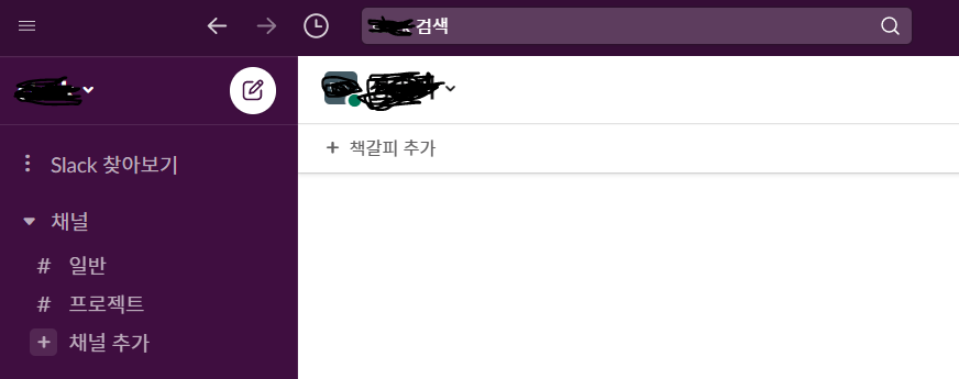 나는 현재 다른 사용자로부터 초대를 받고 수락한 상태다. slack 초대를 수락받으면 이 화면으로 넘어가게 되고, 왼쪽 상단에 채널이라는 걸 볼 수 있다.