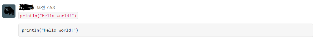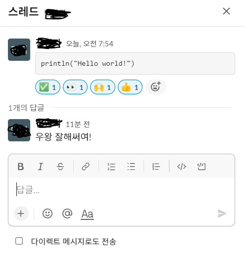 채널에서 여기서 우리는 다양한 형태로 메세지를 보낼 수 있고, 회신할 수 있다. 여기서 되게 좋다는 생각이 들었던 기능이, 코드 또는 코드 블록도 메세지로 보낼 수 있다는 거였다. 코드 일부에 대해 질문하고자 할 때, 이 기능을 써서 상대방에게 질문하면 되게 유용할 것 같다.
