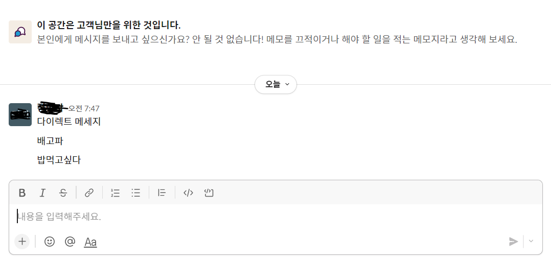 또한 자기 자신한테도 메세지를 보낼 수 있는데, 스스로에게 보낸 메세지는 나만 확인할 수 있다. slack에서 메모장 정도로 활용하라는 기능이다.