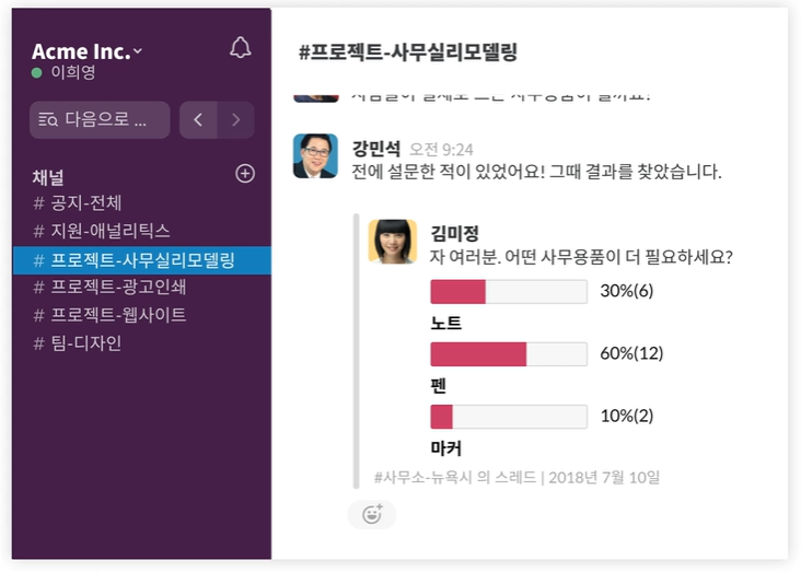 팀과 업무를 하나로 이어주는 단일 플랫폼이다. 그러니까 업무에 관련된 모든 커뮤니케이션을 slack에서 처리할 수 있고, 그에 따라 빠른 업무 확인 및 의사 결정이 가능해 이메일을 대체할 수 있는 업무 협업 툴이다.
