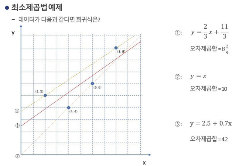 * 최선의 직선을 찾는다는 것은 구해진 선과 데이터 사이의 오차를 최소화하는 것.