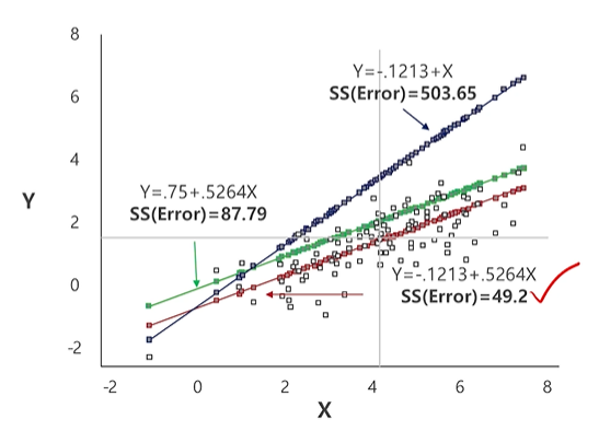 위 그림에서 가장 적합한 선형회귀식은 y = -0.1213+0.5264x